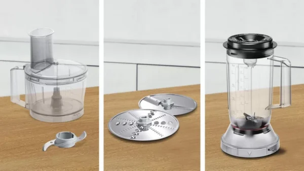 | Komplektis | Lõike- ja riivkettad, vahustusketas, hakkimistera, plastikust blender 1l |