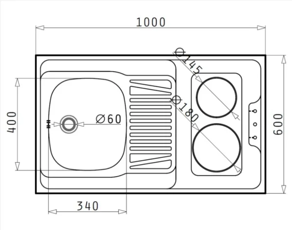 Pliidiplaadi + valamu mõõtmed: 1000 x 600 x 55 mm